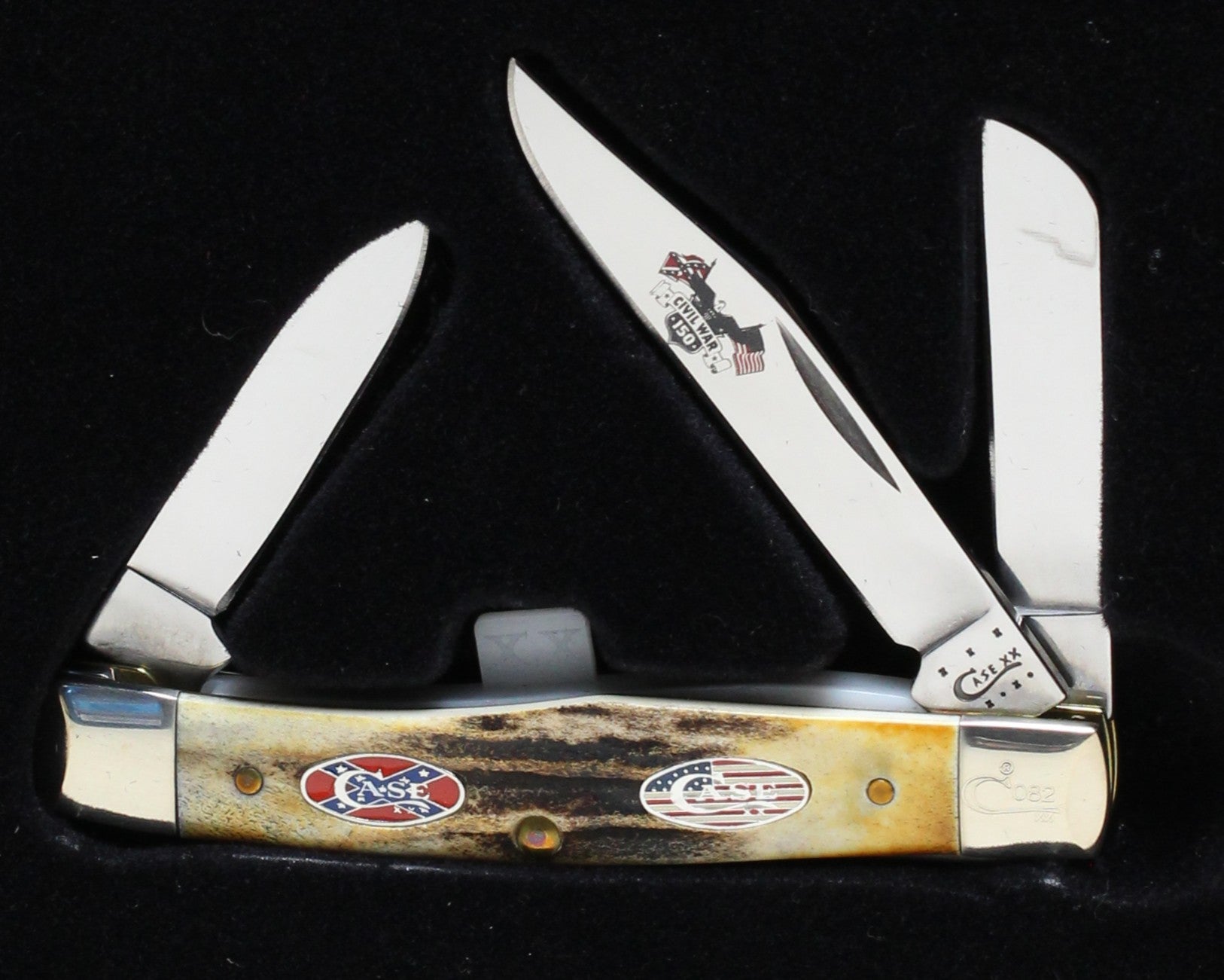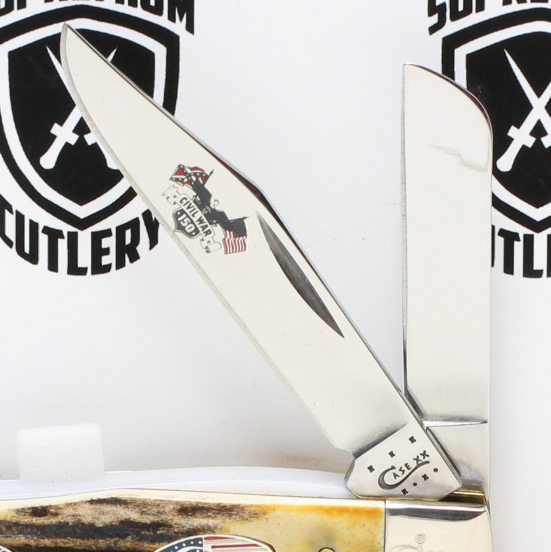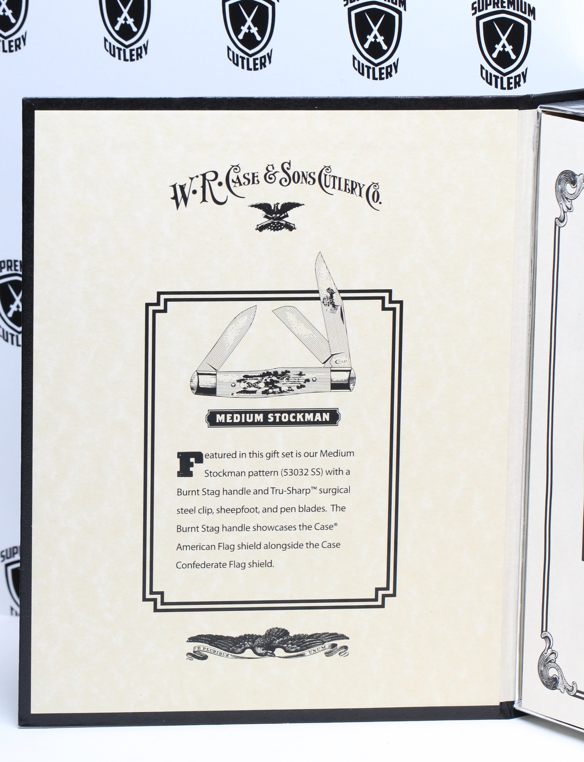 The featured knife is a Medium Stockman pattern (53032 SS) outfitted with a genuine Burnt Stag handle. It boasts three Tru-Sharp surgical stainless steel blades: clip, sheepfoot, and pen. The clip blade is etched with the Civil War 150 logo, which includes crossed Confederate and Union flags—a nod to the duality and tragedy of the conflict.