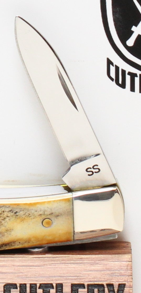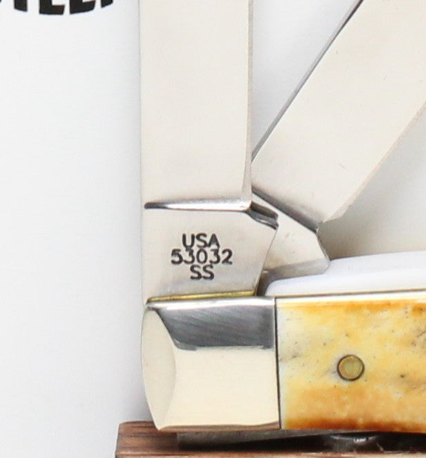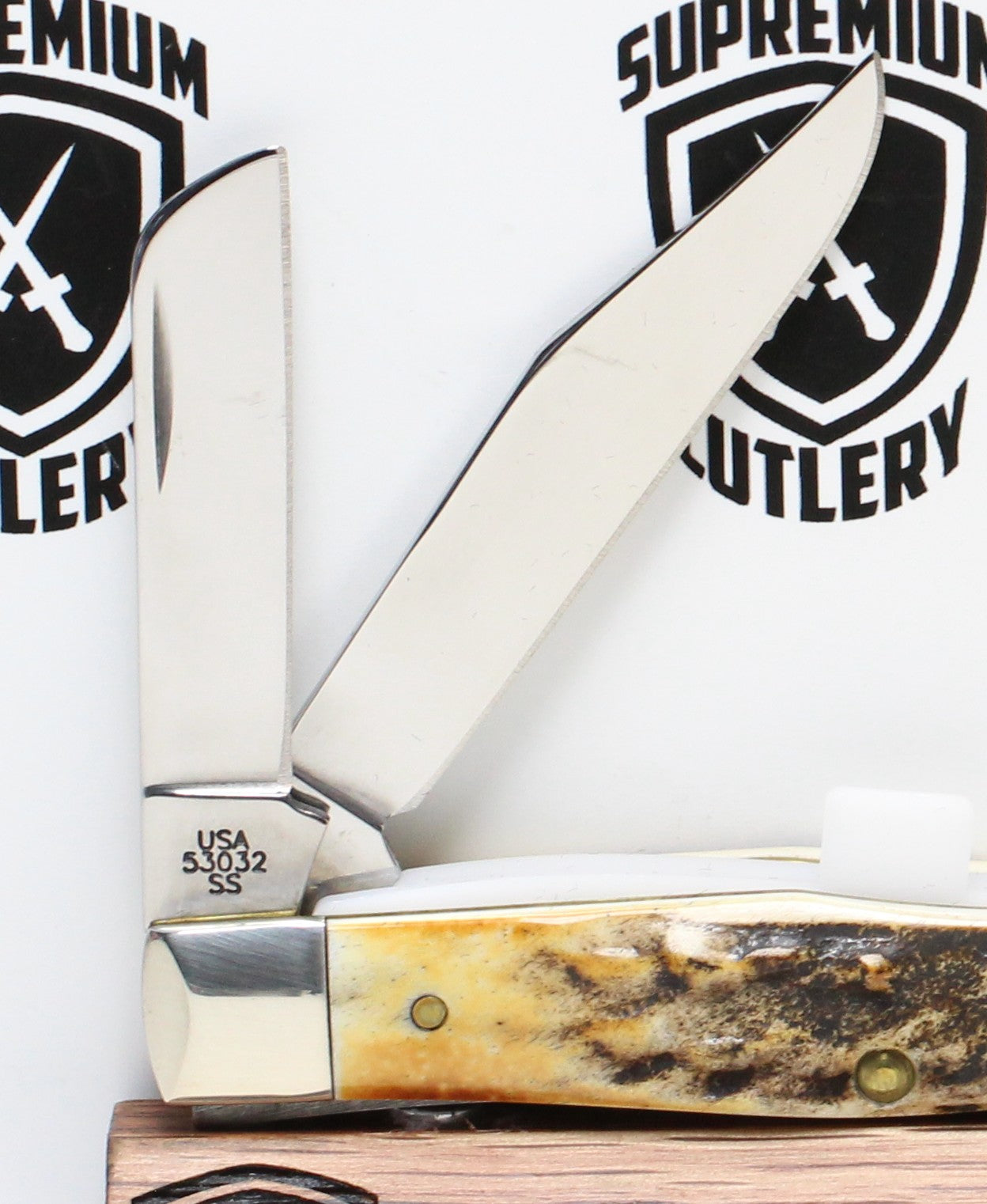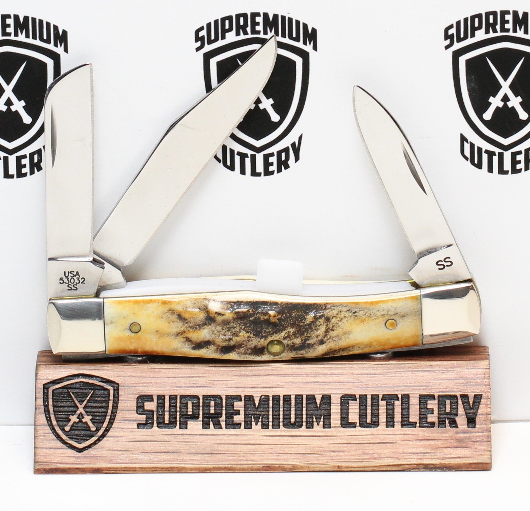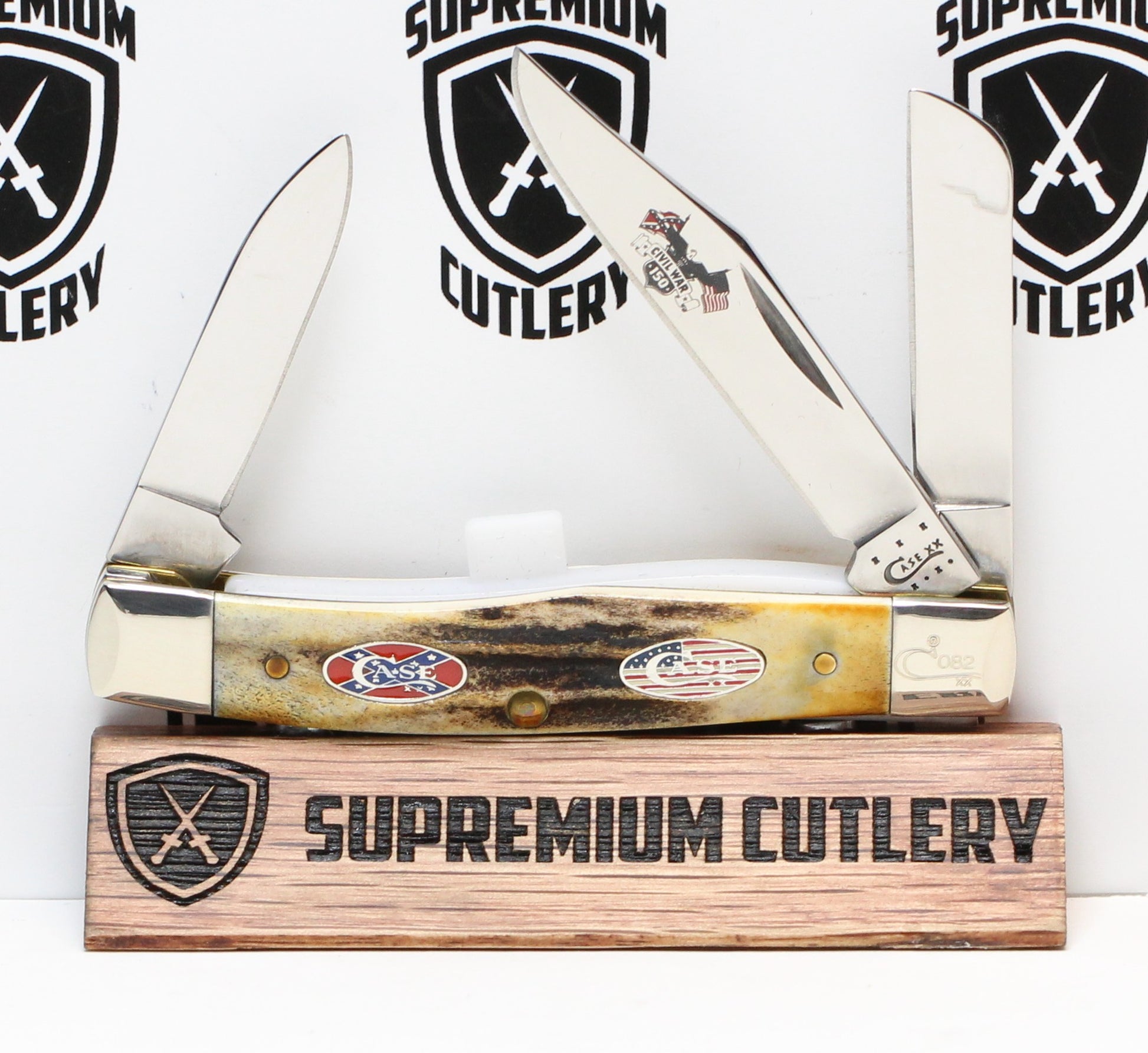 The featured knife is a Medium Stockman pattern (53032 SS) outfitted with a genuine Burnt Stag handle. It boasts three Tru-Sharp surgical stainless steel blades: clip, sheepfoot, and pen. The clip blade is etched with the Civil War 150 logo, which includes crossed Confederate and Union flags—a nod to the duality and tragedy of the conflict.